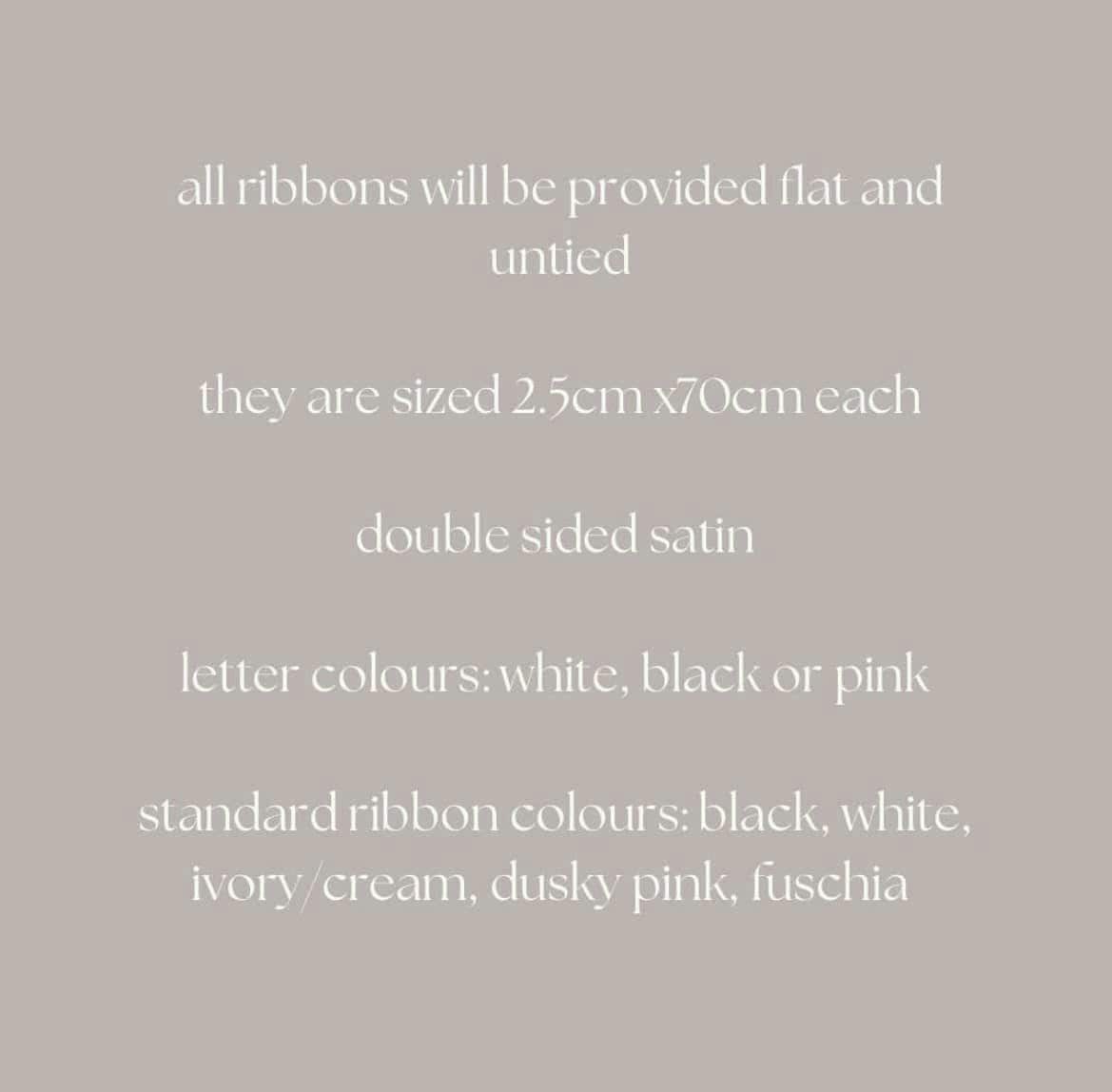 Due to the personalised nature of these ribbons, refunds or exchanges are not available. Ribbons arrive untied and flat. Glassware shown in photos is not included. By placing an order, you agree to the terms and details outlined in this description.